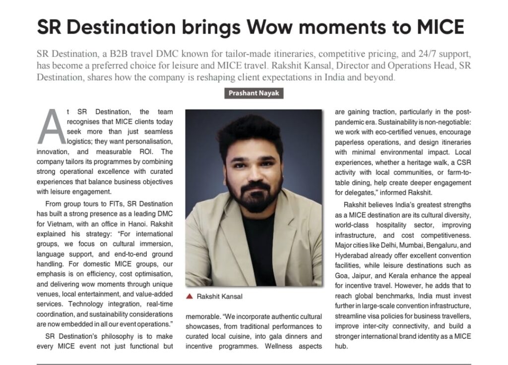 Mr. Rakshit Kansal, Founder & CEO With years of experience in global tourism, Mr. Kansal leads SR Destination with a clear mission — to make international travel simple, seamless, and profitable for B2B agents. His focus on quality service and agent satisfaction has made SR Destination one of the fastest-growing names in the industry